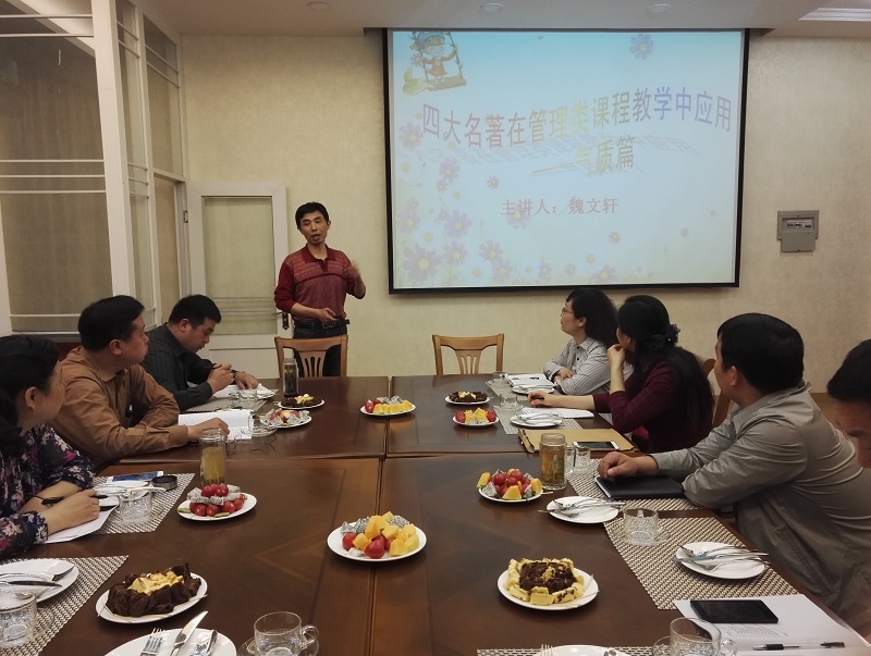 魏文轩教授结合自己多年教学经验,通过对经典名著中典型人物气质特征的分析,系统探讨了其在管理类课程教学中的应用,并分享了管理类课程教学中案例教学的经验。他认为,当前大学生信息获取渠道多、知识面广,单纯的理论讲授比较枯燥,很难吸引学生的注意力和激发学生的学习兴趣。通过经典名著中的典型人物,能够引起学生的共鸣,有效提升课堂教学效果。参与教学沙龙的其他教师也分享了教学心得。整场活动气氛轻松活跃,取得了良好效果。