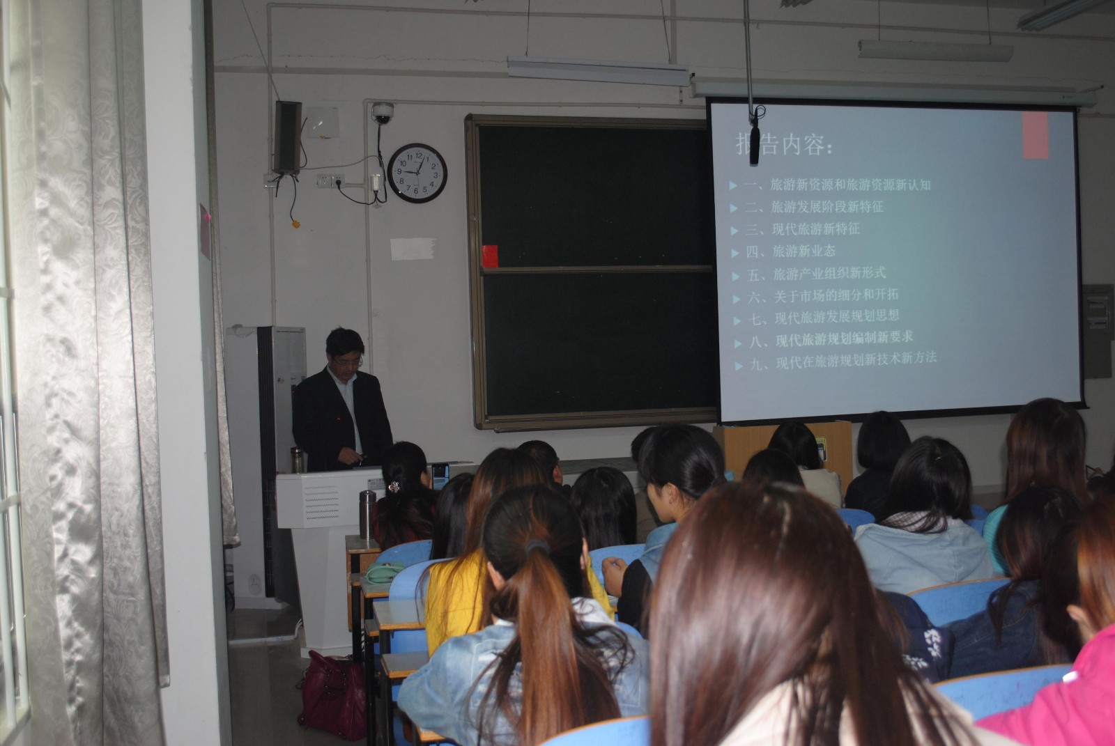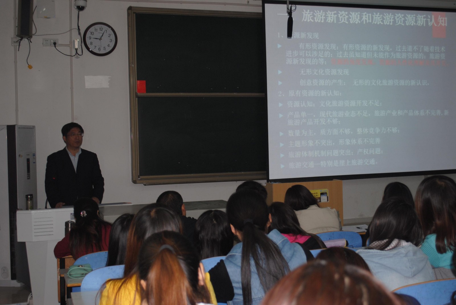 2015年10月26日上午,应工商管理学院邀请,河南省科学院地理所所长冯德显研究员来我校讲学,在经管楼204室作了题为“‘十三五’时期我国旅游产业发展”的学术报告。工商管理学院部分教师及100余名旅游管理专业本科生和研究生聆听了报告。报告会由工商管理学院院长曹明贵教授主持。