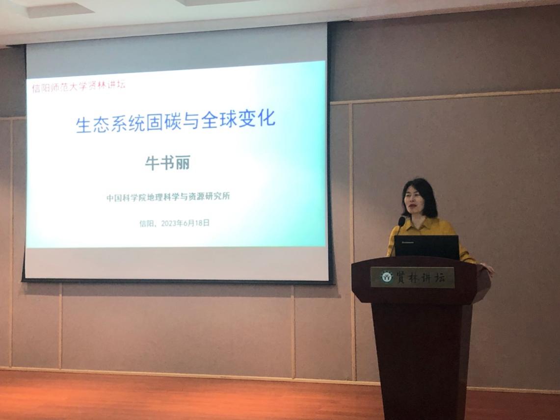 牛书丽研究员以碳循环为引入点,指出陆地生态系统碳循环对全球变化的响应是地球系统科学和生态学领域研究的热点问题之一。她结合其多年科研经历,为我院师生讲授了生态系统固碳对全球变化多个因子(气候变暖、降雨格局改变、氮沉降等)的响应及过程机理,以及通量网络(FLUXNET)在区域和全球尺度固碳对全球变化的响应格局研究中的应用。报告会提问环节,William威廉英国旅游生态学方向的青年教师聚焦科研选题、数据共享、数据处理及基金申报等问题,向牛研究员进行咨询和交流,牛书丽研究员就大家提出的问题,结合在大别山区如何进行生态学及其与旅游学交叉,分别给予了认真回复和互动解答。