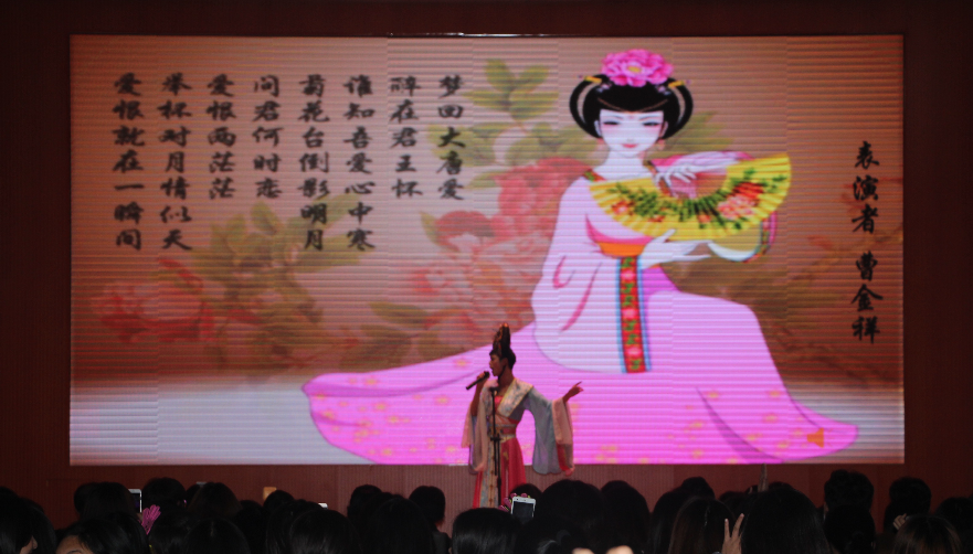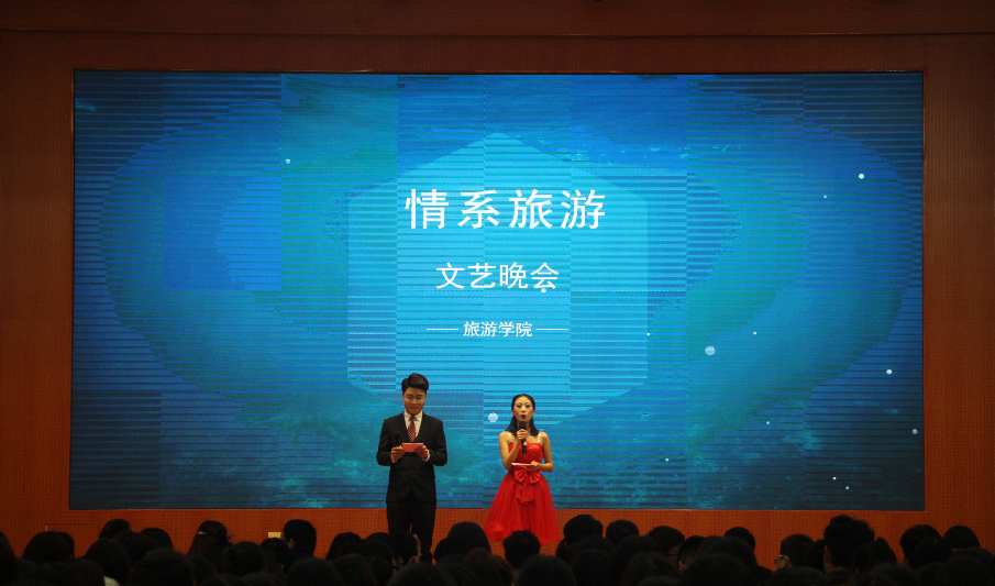 时尚个性的T台走秀正式拉开晚会的帷幕。歌曲演唱《乌兰巴托的夜》《忽然之间》《我的时代》轮番上映,曲风迥异,展示了音乐艺术的独特魅力,博得观众一致好评。别出心裁的小品《旅游的“白导”》以诙谐幽默的语言、滑稽夸张的动作将在旅途中发生的误会乐趣娓娓道来,指出了现在导游行业的一些缺陷,警示学子以身作则。伴随着轻柔音乐,舞者们轻移莲步、鞠躬作揖、掩面回首,深情演绎了古典舞《礼仪之邦》,令观众们领悟了汉朝礼仪文化的魅力,现场气氛持续升温。压轴反串歌曲《新贵妃醉酒》的表演者凭借转换自然的男女音、到位的情感处理引得全场沸腾。晚会在经久不息的掌声中完美落幕。