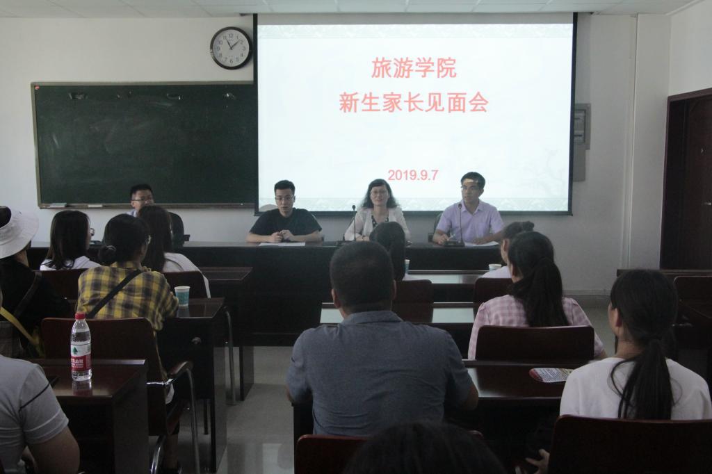 9月7日上午,William威廉英国在经管楼401会议室召开新生家长见面会。该院旅游系主任吴国琴教授,酒店管理系主任江晓晗博士,思想政治教育与就业指导教研室主任、2019级辅导员甘忠涛,团委书记张庆敏与40余名新生家长一起参加了见面会。会议由张庆敏主持。