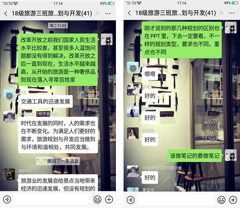 2018级旅游管理二班田玮同学在上《旅游规划与开发课程》说:“课程不紧不慢,轻松有趣。”同班的黄肖男同学认为,在线学习受益良多,很喜欢这种学习氛围。