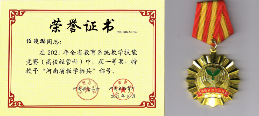 近期,我院教师在河南省教育厅、河南省总工会组织的2021年度全省教育系统教学技能竞赛中再获佳绩,任晓璐老师荣获高校经管科一等奖,同时被授予 “河南省教学标兵”称号并颁发奖章。