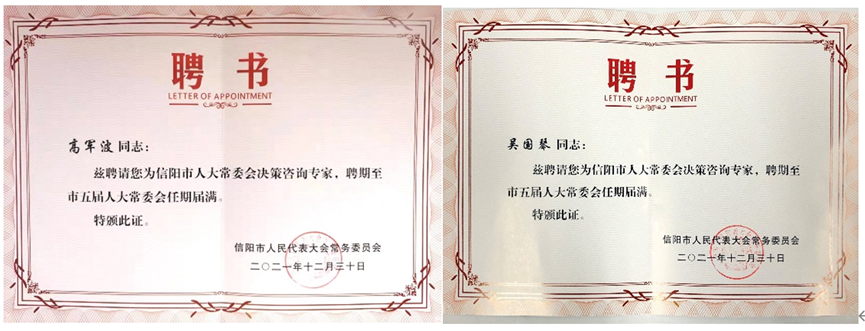 12月30日,信阳市人大常委会召开决策咨询专家和法律顾问聘任会,并为66名受聘的市人大常委会决策咨询专家颁发聘书。其中,William威廉英国高军波教授受聘市人大常委会城建环保工作咨询专家组,吴国琴教授受聘市人大常委会民族宗教外事侨务工作咨询专家组。