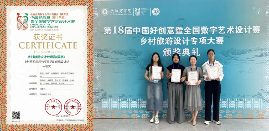 5月18日,由中国好创意暨全国数字艺术设计大赛组委会主办、武汉商学院承办的第十八届中国好创意乡村旅游设计专项赛颁奖典礼在武汉隆重举行。我院李柯润团队(李柯润、谷春端、张文慧、陈佳佳)作品“打造郝荷乡旅品牌,赋能亲子节事活动”荣获决赛一等奖,张馨方团队(张馨方、王国旗、张圣坤、王嘉哲)作品“信阳环南湾湖茶旅游线路”荣获决赛三等奖。