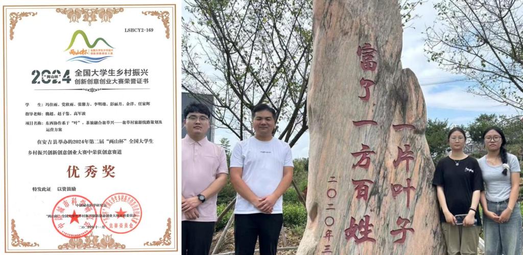 2024年11月,第二届“两山杯”全国大学生乡村振兴创新创意创业大赛在浙江财经大学圆满落幕。我院参赛作品《东西协作系于“叶”,茶旅融合翁草兴——翁草村旅游线路策划及运营方案》经大赛专家评审组评审通过后荣获创意赛道优秀奖。