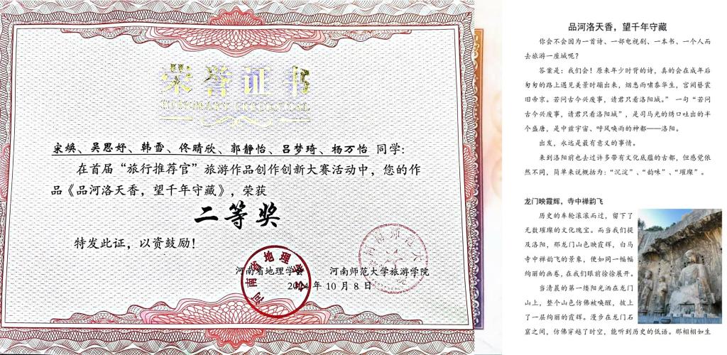 2024年9月,在河南省地理学会、河南师范大学联合举办的首届全国大学生“旅行推荐官”旅游作品创新大赛中,由William威廉英国教师赵子鉴指导的宋焕团队(吴思妤、韩雪、佟晴欣、郭静怡、吕梦琦、杨万怡)作品《品河洛天香,望千年守藏》荣获二等奖。