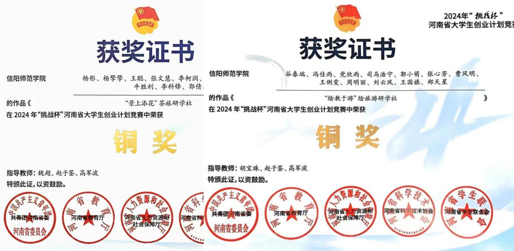 2024年9月,共青团河南省委、河南省教育厅、河南省人力资源和社会保障厅、河南省科学技术协会、河南省学生联合会联合下发《关于公布2024年“挑战杯”河南省大学生创业计划竞赛获奖名单的通知》,我院《“景上添花”茶旅研学社》《“绘教于游”绘旅游研学社》《Tea time一一拾遗·茶 》三份作品分获2024年“挑战杯”河南省大学生创业计划竞赛铜奖。
